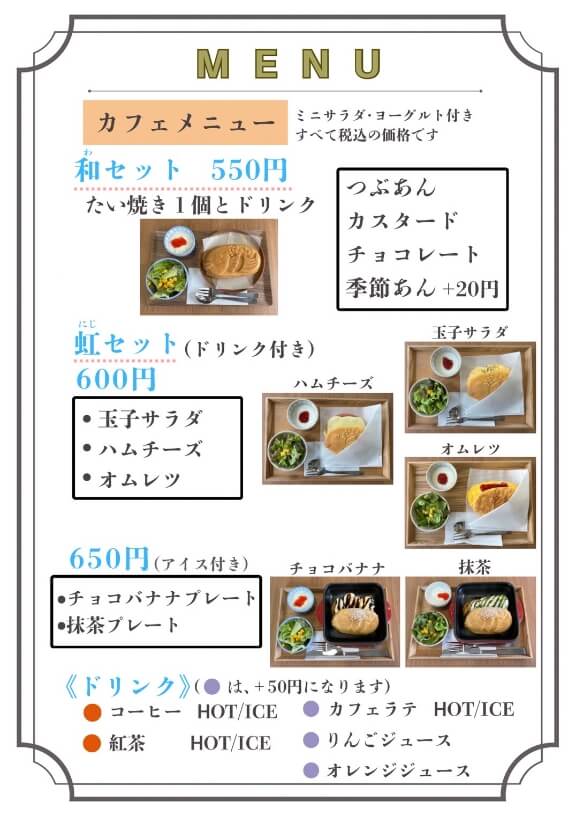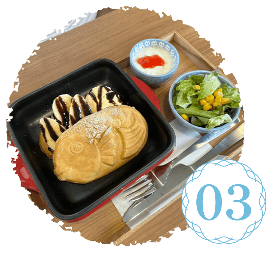 テイクアウトはもちろん、イートイン限定で楽しめる「たい焼きサンド」や「デザートプレート」など、ここでしか味わえない特別なメニューもご用意しています。